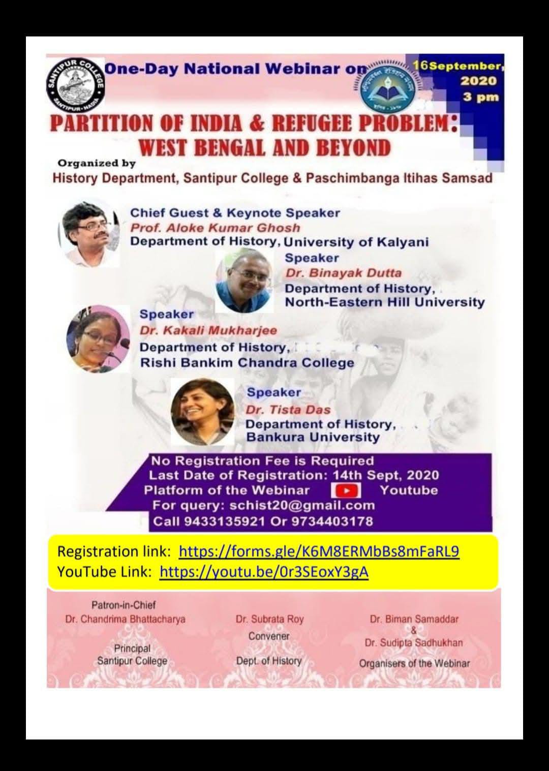 National level webinar | Prof. Alok Kumar Ghosh, Associate Professor in History, Kalyani University | Topic: Partition of India and Refugee Problem: West Bengal and Beyond You tube Link: View |