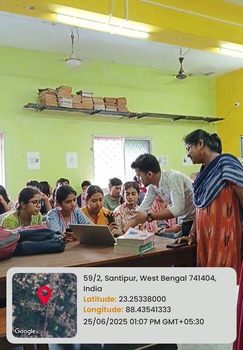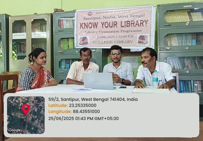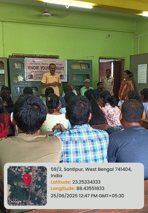 The Central Library of Santipur College organized the “Know Your Library” orientation program on June 25, 2025, with the objective of introducing students and faculty to the wide range of academic resources and facilities available in the library. The program witnessed enthusiastic participation from undergraduate students across different disciplines, as well as faculty members of the college.