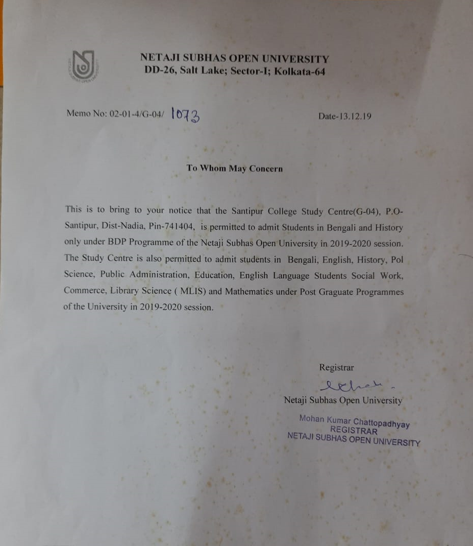 Santipur College has been hosting a Study Centre of Netaji Subhas Open University (NSOU) since 2004, bearing the centre code G 04.