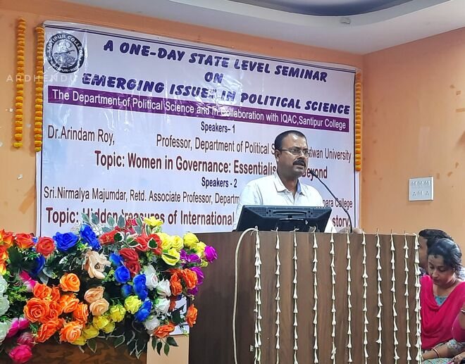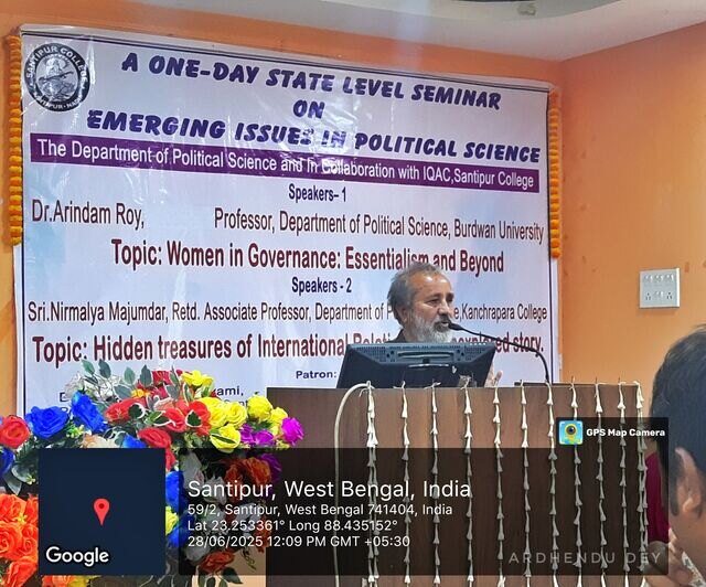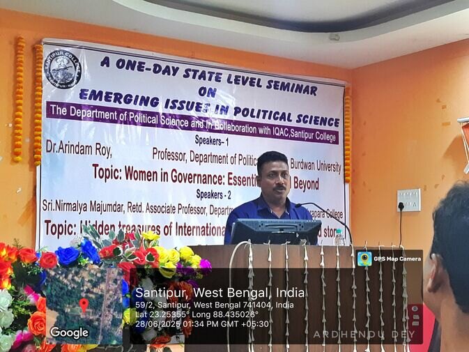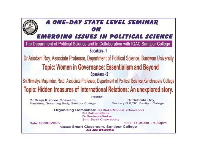Seminar on : A One day State Level seminar on Emerging Issues in Political Science | Dr. Arindam Roy, Associate Professor, Department of Political Science, Burdwan University | Topic: Women in Governance: Essentialism and beyond. Jointly organized by the Department of Political Science in collaboration with IQAC, Santipur College. Thought-provoking perspectives were shared, engaging the audience in lively discussions. The event proved to be an enriching experience for students, researchers, and faculty members, broadening their understanding of contemporary political issues. A Report : View |